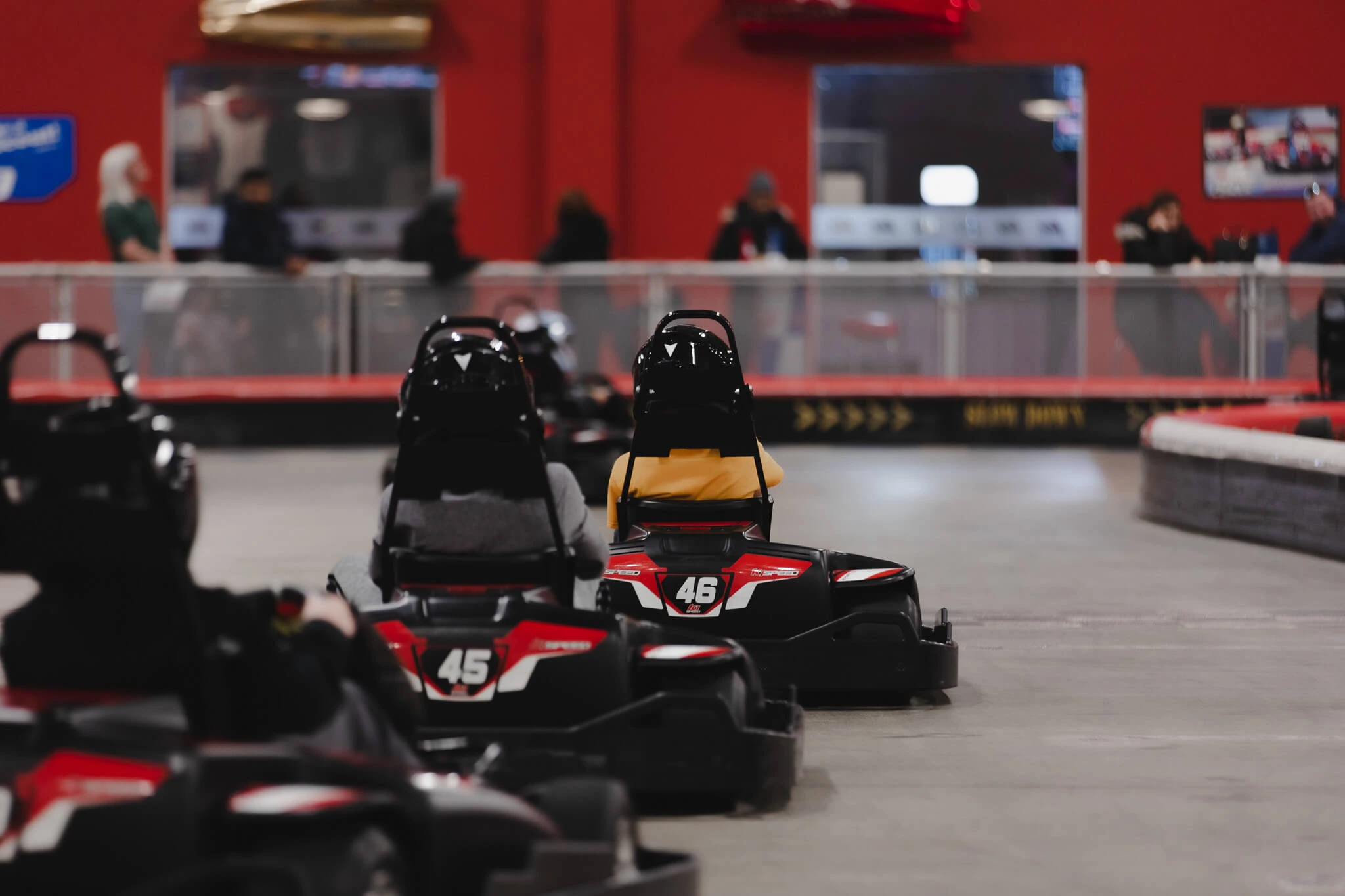 Most visits last 60 to 90 minutes depending on how many races are booked. Many guests stay longer to enjoy the arcade games and paddock lounge restaurant.